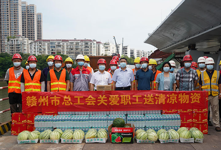 為鞏固解困脫困工作成果,提高職工生活品質,使高溫下作業(yè)的一線職工有更多的獲得感、幸福感、安全感,8月25日,贛州市總工會二級調研員賴定銘一行來到贛州城投集團南河大橋拓寬改造(二期)工程項目工地開展“關愛職工 夏送清涼”走訪慰問活動,送上市總工會的關懷。贛州城投集團黨委副書記黃家偉,工程管理公司相關負責人,集團工會、文化宣傳部、項目部業(yè)主、監(jiān)理和施工單位相關人員等參加慰問。