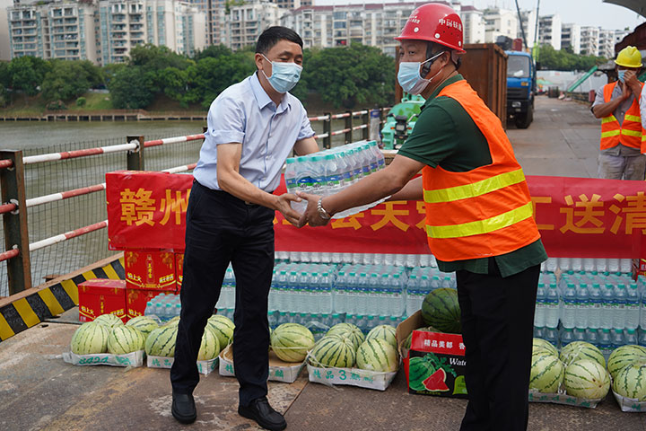 在慰問現(xiàn)場,賴定銘一行為南河大橋拓寬改造(二期)工程項目高溫下堅守崗位的一線職工發(fā)放了西瓜、礦泉水、王老吉等防暑降溫物品,并與項目一線職工交流談心,詢問了職工積極推進項目建設進展情況,聽取了贛州城投集團高溫津貼發(fā)放情況和落實高溫天氣作業(yè)勞動保護的有關措施,叮囑大家要科學安排高溫期間的施工任務,要堅持勞逸結合,特別要注意身心健康和施工安全,要認真做好項目工地疫情防控工作。