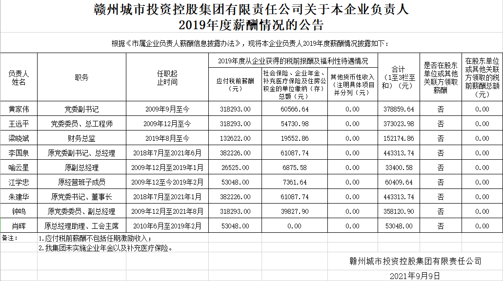 贛州城市投資控股集團(tuán)有限責(zé)任公司關(guān)于本企業(yè)負(fù)責(zé)人2019年度薪酬情況的公告